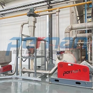 催化劑物料由加料系統(tǒng)均勻的送入粉碎室受到高速旋轉(zhuǎn)的粉碎盤的強(qiáng)烈沖擊,同時(shí)受到離心力的作用,與粉碎齒圈發(fā)生碰撞,受到剪切、摩擦、碰撞等多種綜合力的作用,使物料粉碎,被粉碎的物料隨氣流運(yùn)動(dòng)到分級(jí)區(qū),通過(guò)變頻調(diào)節(jié)的分級(jí)輪,對(duì)粗細(xì)物料進(jìn)行分離,符合細(xì)度要求的產(chǎn)品隨氣流進(jìn)入旋風(fēng)收集器和除塵器收集,粗物料返回分級(jí)區(qū)二次粉碎。